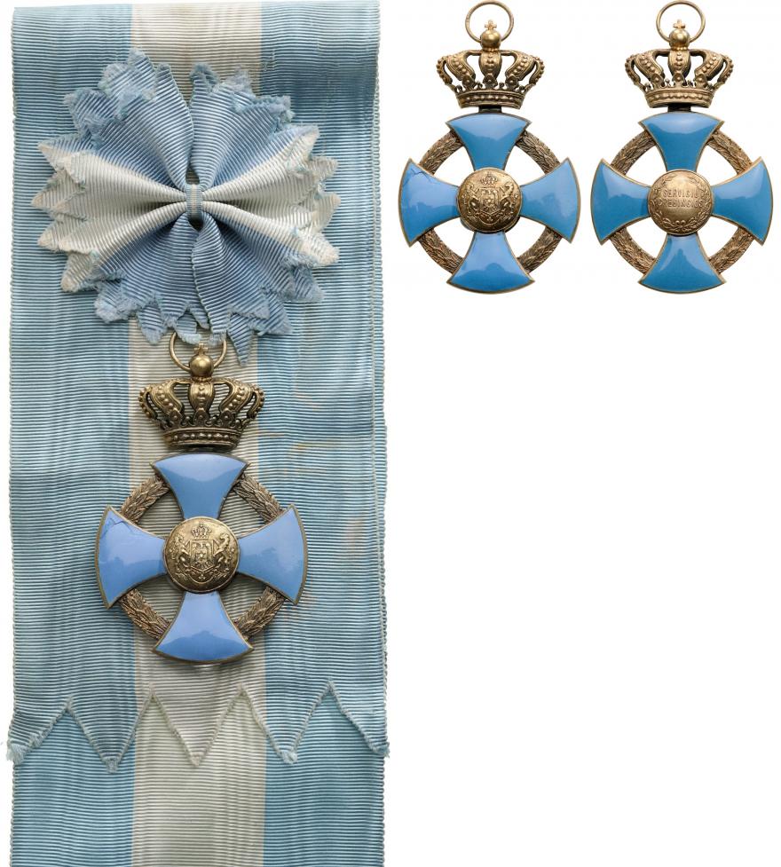 Grand Cross Badge, 2nd Model, Civil, instituted in 1935. Sash Badge, 85x57 mm, gilt Silver, hallmarked "crown", concave cross, rounded light blue enamel on both sides (some damages) and laurel wreaths between the limbs. The medallion on the obverse with Romanian coat of arms, the reverse medallion with the inscription Serviciu Credincios (Loyal Service), original sash. Very rare badge, in very fine condition! Awarded only 35 times! RR! II-